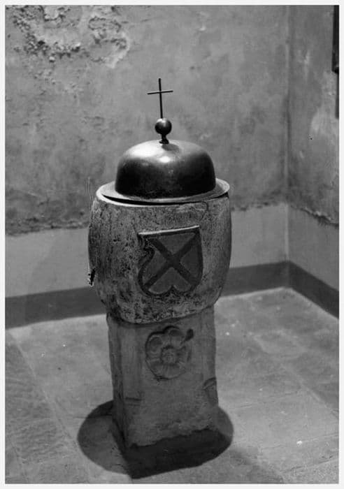 Fonts baptismaux en grès jaune avec des traces de polychromie. Le support, aux angles chanfreinés, est orné d'une rose.