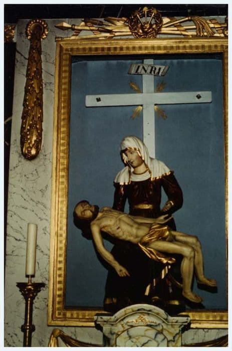 La Vierge, assise au pied de la croix, porte le corps du Christ sur ses genoux. Ce dernier a l'aspect d'un cadavre.