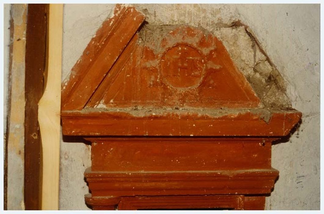 Custode en forme d'édicule dont le fronton est orné d'un soleil comportant les lettres IHS.
