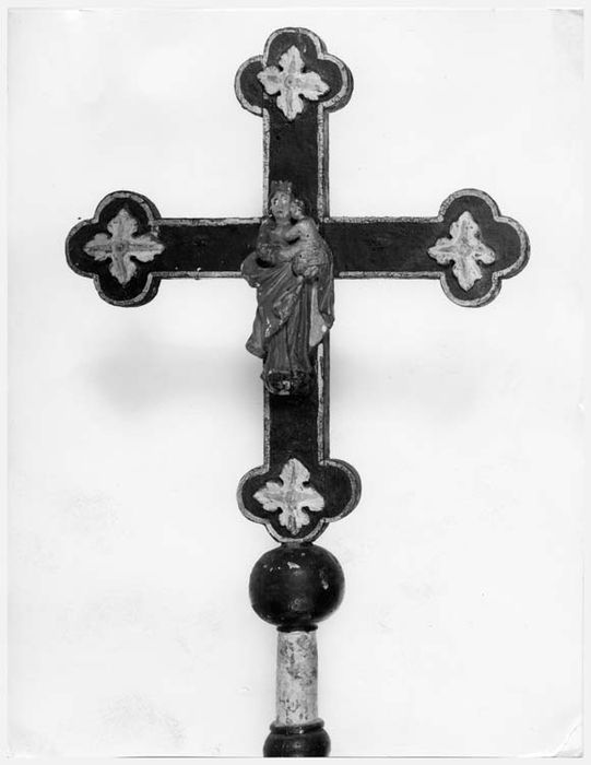 Croix aux branches égales et aux extrémités trilobées ornées de rosettes. Elle est ornée, en son centre, d'une statuette de la Vierge à l'Enfant.