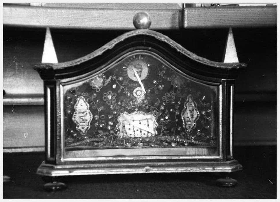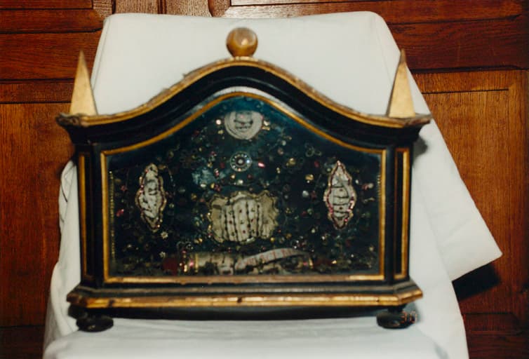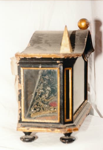 Reliquaire rectangulaire dont la partie supérieure de la face principale est curviligne. Deux pyramidions surplombent les angles et une boule couronne le sommet de l'arc. Le panneau de la face principale est peint orné en relief.