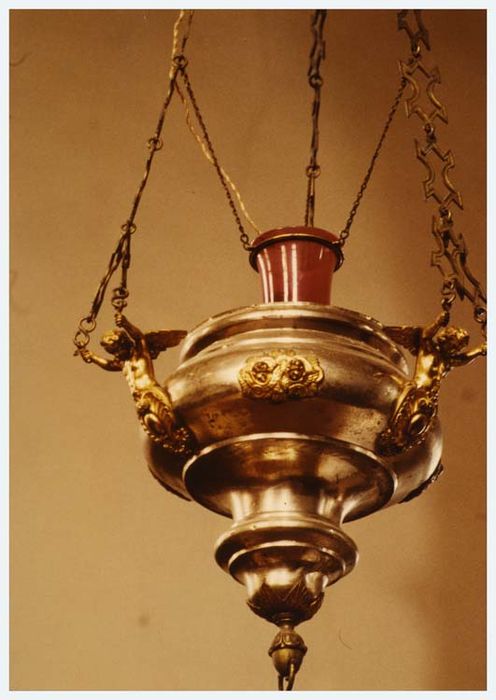 Lampe suspendue par trois chaînes tenues par des anges aux ailes déployées. Trois paires de têtes d'angelots ornent la cuve qui se termine par un bouton à anse à la partie inférieure.