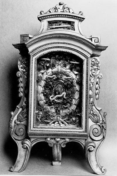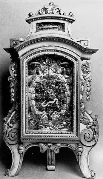 Reliquaire-monstrance avec niche vitrée, sur trois pieds. La niche est encadrée de deux accolades végétales. Derrière la vitre, la lunule est ceinte d'une couronne de lauriers et de fleurettes. Cette niche est couronnée d'un fronton cintré au-dessus duquel se situe une autre petite niche vitrée.