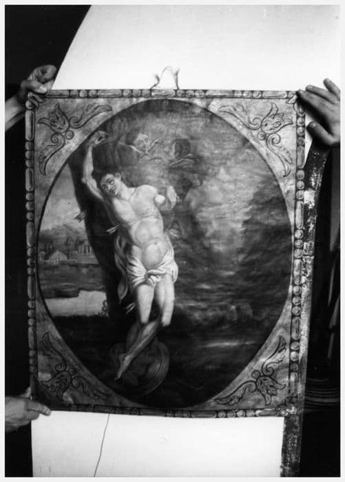 saint Sébastien ; saint Roch ; flèche ; arbre ; village ; architecture ; chien ; livre ; bourdon