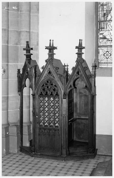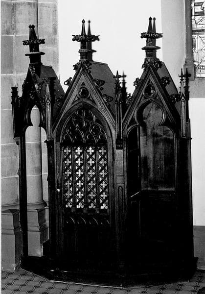Confessionnaux de style néo-gothique. Ils sont divisés en trois loges et comportent un décor architecturé fait de gâbles et pinacles.