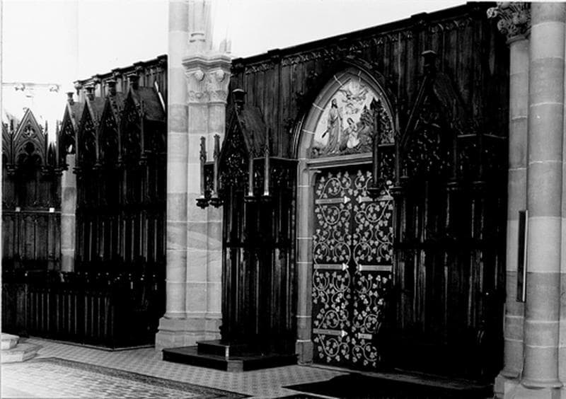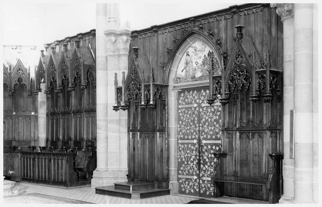 Ensemble de style néo-gothique. Les lambris sont composés de pilastres qui délimitent des panneaux scuptés de lancettes. Les stalles sont surmontées de dais avec gâbles et pinacles.