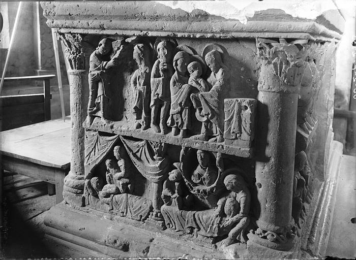 Bas-reliefs : Le Christ au milieu des apôtres (face principale) ; Figuration de la donation de l'église et inscription (côté de l'Epître) ; Annonciation, Présentation, Mort de Louis le Débonnaire (côté de l'Evangile).
