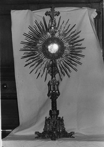 Lunule rayonnante, surmontée d'une croix où le Christ est placé, dans une mandorle, en majesté. Lunule entourée de huit médaillons en émaux sertis de perles. Evangélistes et apôtres sont représentés deux par deux. Au verso, ceps de vigne et épis. Les médaillons sont entourés de pampre de vigne. Pied reposant sur une base en forme d'édifice en croix grecque. Quatre personnages sous des niches : David avec sa harpe, son javelot ? et deux personnages difficiles à identifier. Le pied se termine par quatre avant corps de lion. Les litanies de la Vierge courent sur un listel en émail bleu. Au noeud, sous des arcades, la Vierge en majesté, saint Joseph.