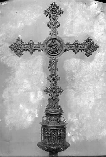 Croix à branches égales à section rectangulaire, renflées en demi-cercle latéralement en leur milieu et terminées par un disque sur lequel posent latéralement trois têtes de chérubins. Une tête saillante garnit le médaillon de chaque extrémité, et les lobes intermédiaires. Face : Christ couronné d'épines, attaché par trois clous. Dans le disque qui outrepasse l'intersection des bras, les trois croix du calvaire. Revers : même décoration. La Vierge à mi-corps allaitant d'Enfant Jésus dans le disque central. Noeud cylindrique cantonné de six paires de termes détachées, portant une corniche lisse, que surmonte un cylindre bas en retraite accosté de six consoles détachées : six statues d'apôtres debout dans des niches entre les termes. Les termes reposent sur un tore orné de têtes en relief à l'aplomb de chacune des leurs paires. Douille à côté sous un court balustre fauillagé, inséré sou un culot.