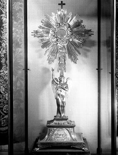 Un ange en pieds porte sur sa tête un soleil qui contient l'hostie.