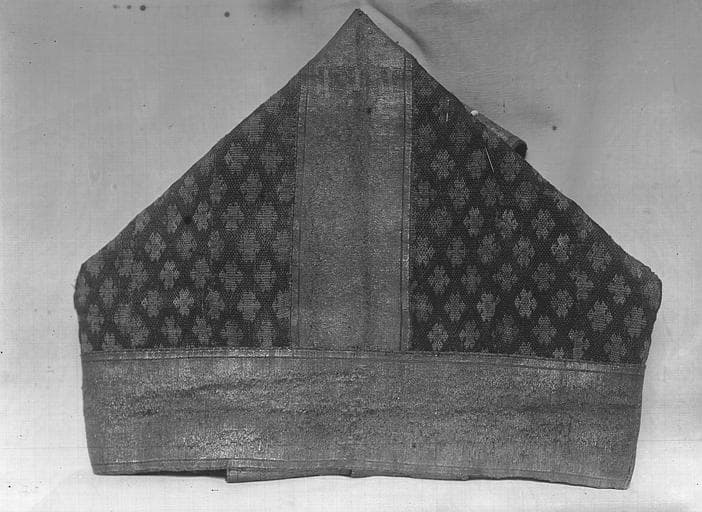 Sur le devant, saint Pierre et saint Paul brodés au point fendu. Larges orfrois tissés d'or. Plaques métalliques de forme triangulaire au bord des orfrois : trois plaques circulaires portant au repoussé La Vierge à !'Enfant, la Fuite en Egypte, le Christ de la Résurrection.