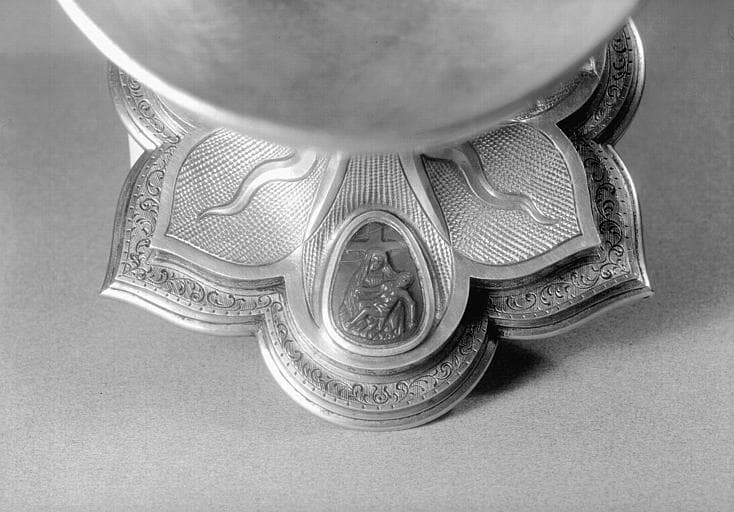 Large coupe hémisphérique. Pied à trois lobes circulaires alternant avec trois lobes ogivaux. Sur les lobes circulaires, Crucifixion, Vierge à l'Enfant. Agathe de forme ovoïde sur laquelle est gravée une Pietà. Noeud orné de six boutons carrés.