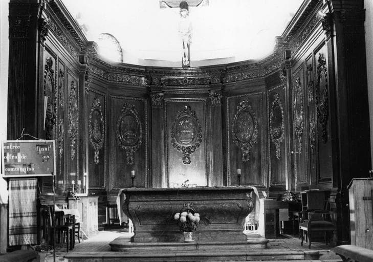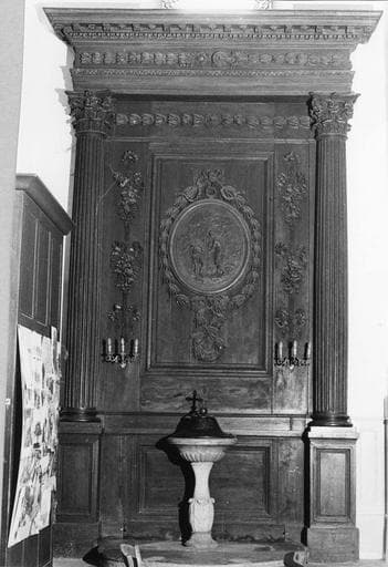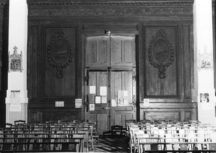 7 panneaux dans le choeur, 2 grands panneaux latéraux, 5 panneaux au fond de l'église. Les lambris sont formés de panneaux séparés par des colonnes corinthiennes. Chaque panneau est orné d'un médaillon entouré d'une guirlande ; à l'intérieur se trouvent les emblèmes de l'ancien et du nouveau testament. Des lambris plus étroits sont décorés d'objets liturgiques : chandelier à 7 branches, arche d'alliance. Les boiseries latérales sont encadrées de colonnes corinthiennes.