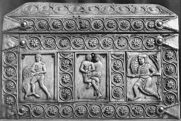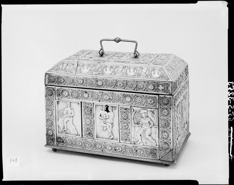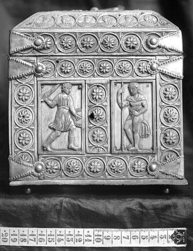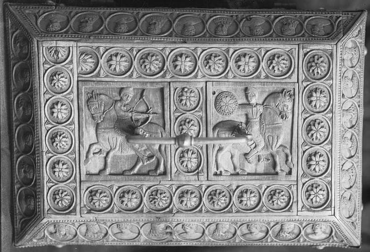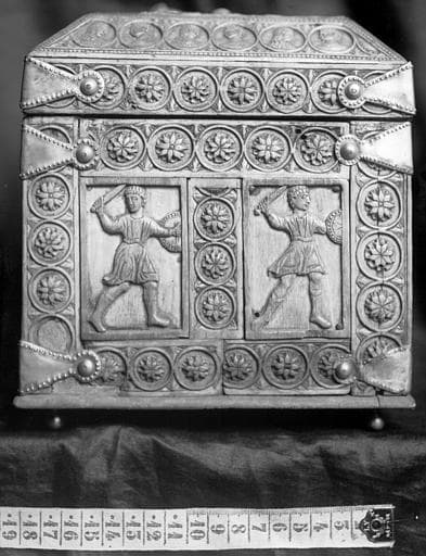 Formée de plaques d'ivoire montées dans des frises ornées d'anneaux encadrant des rosaces ou des bustes. Couvercle plat par dessus un biseau. Les plaques représentent des luttes d'hommes armés de lances ou d'épées et d'un bouclier combattant entre eux ou contre des animaux. Sur le couvercle, deux cavaliers dont un lance une flèche. La face postérieure manque.