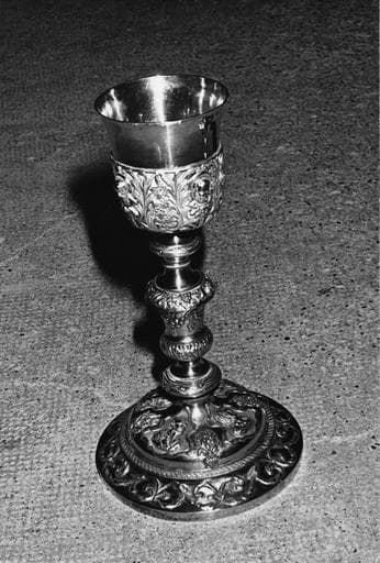 Base circulaire. Pied : large bordure décorée de rinceaux ; en ressaut décor ciselé avec en buste, le Christ, la Vierge, saint Pierre, entre roseau, vigne, blé, croix. Noeud : en balustre, avec décor de raisin. Coupe : fausse coupe, en demi ronde-bosse buste des évangélistes avec en-dessous leur symbole ; décor de feuillage.