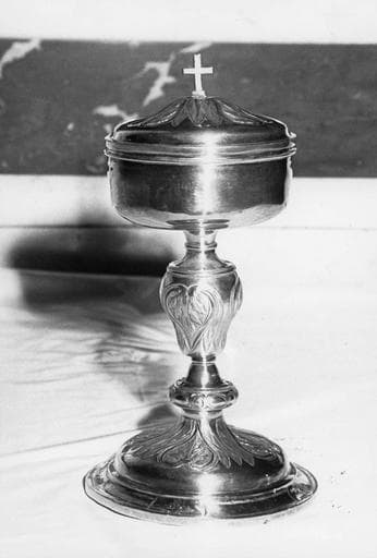 Pied circulaire formé d'un cavet surmonté d'un talon. Il est décoré de cartouches de feuillage entre lesquels se trouvent de longues feuilles. Tige à noeud piriforme au-dessus d'une colerette. Même décor ciselé que sur le pied. Pas de fausse coupe. Couvercle décoré de feuilles allongées et surmonté d'une croix nue.