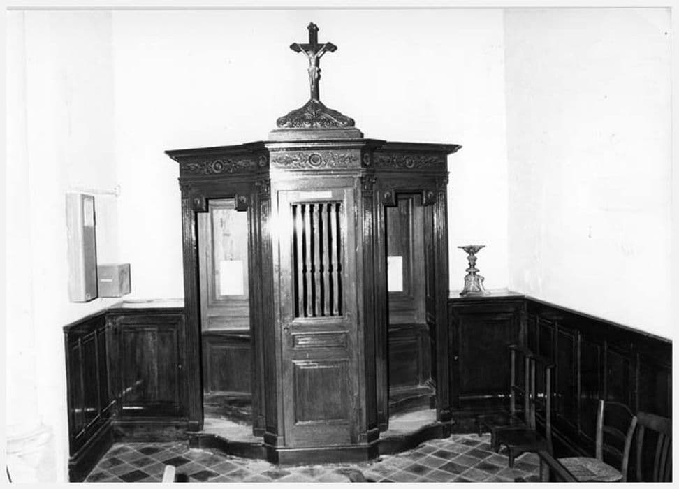La partie supérieure du confessionnal est bordé d'un bandeau décoré de palmettes avec une rosace centrale. Egalement mouluré avec des palmettes et des entrelacs, le fronton, qui domine la porte centrale et qui est surmonté d'un crucifix. Les portes latérales sont bordées de pilastres, cannelés à chapiteaux composites. La porte centrale est ouverte par cinq barreaux et à deux panneaux moulurés en sa partie inférieure.