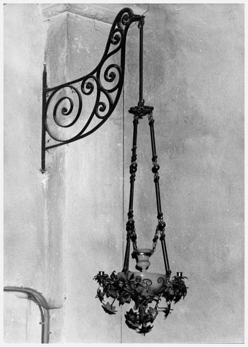 Lustres du croisillon sud : coupe en opaline bleue surmontée d'un vase et entourée d'une guirlande de fleurs blanches avec six bougeoirs. Lustres du croisillon nord : coupe en opaline blanche, même décor, fleurs de couleur métallique. Par des cordons perlés, ils sont accrochés à une potence en fer forgé décorée en volutes.