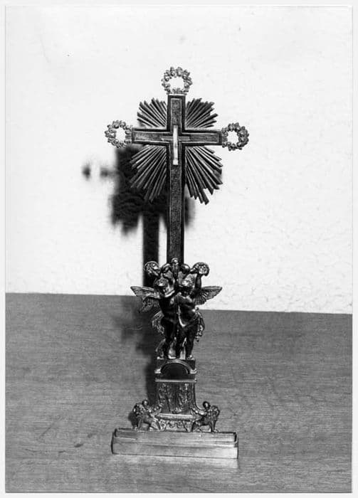 A la place du Christ, une ouverture en croix pour y placer des reliques. De faible épaisseur, la croix est soutenue au verso par une volute.