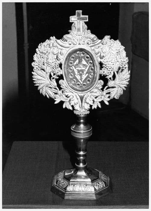 Base octogonale décorée de chardons stylisés. Tige annelée. Lunule vitrée et entourée d'une corne d'abondance qui déverse des fruits, des épis de blé, des feuilles de vigne et du raisin. Elle est surmontée d'une croix.