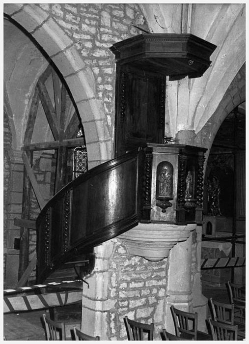 Cuve hexagonale reposant sur un cul de lampe. Elle est décorée de panneaux rectangulaire séparés par des colonnes torses. Dans chaque panneau, une niche abrite un personnage sur socle et en stuc. L'abat-voix est à bandeau mouluré, le dosseret est décoré de deux colonnes torses. La rampe de l'escalier est faite de panneaux pleins décorés de quatre colonnes torses.