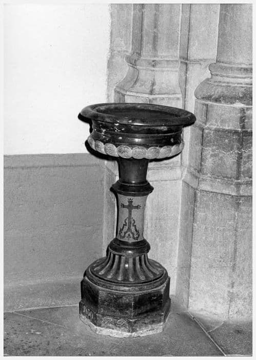 Bénitier à base octogonale. Pied circulaire décoré de cannelures resserrées par le noeud. Entre deux noeuds, le fût est décoré d'une croix décorée. La partie inférieure de la cuve est ornée de godrons, la partie médiane resserrée par une mouluration et la partie supérieure composée d'une large bordure.