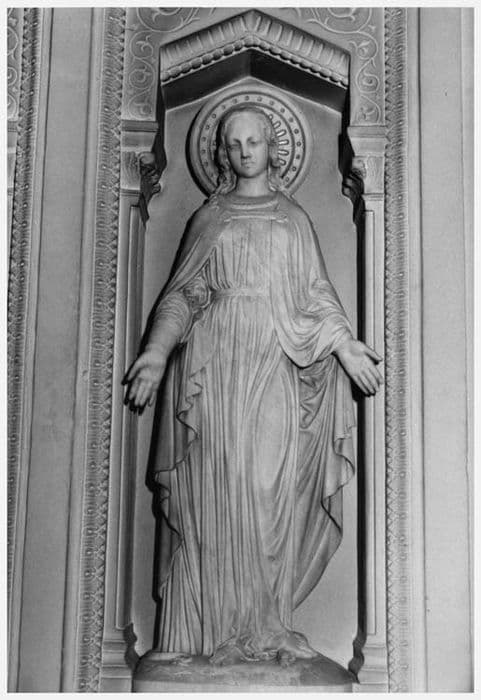 Statues insérées dans des niches en forme de dais à pilastres corinthiens.