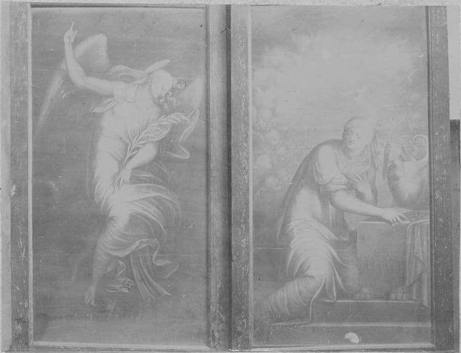 Panneau central : la Mise au tombeau. Volets : les donateurs, Catherine Mairot et Jeanne Le Moyne. Sur la face extérieure des volets, l'Annonciation en grisaille.