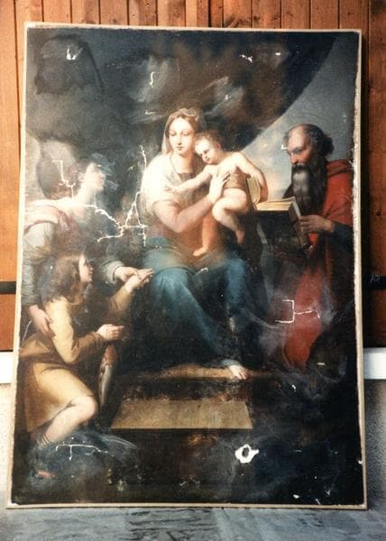 tableau : Vierge à l'enfant présentée à un jeune personnage tenant un poisson par l'intermédiaire d'un ange devant saint Marc