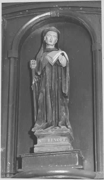 Statue d'une abbesse bénédictine, vénérée sous le nom de saint Benoît, portant le costume bénédictin, avec un voile sur la tête.