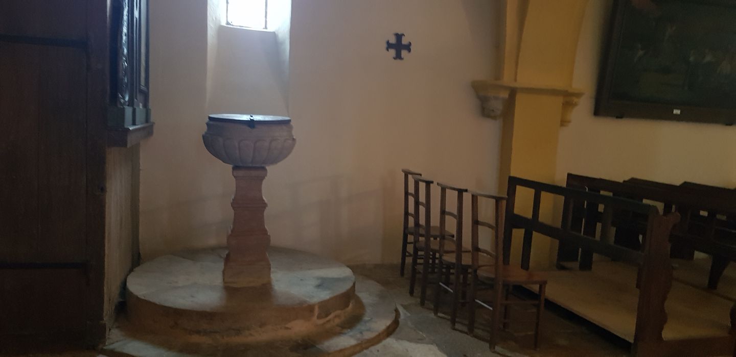 Bénitier en marbre rouge. Cuve ovale, pieds à griffes de lion.