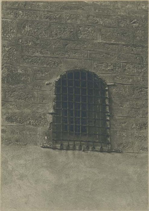 Grillage établi dans le mur donnant sur le cimetière de manière à permettre aux fidèles de voir la lampe brûler pour le saint sacrement.