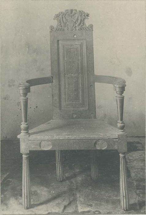 En forme de fauteuil, avec bras arrondis, et dossier très étroit orné d'un panneau sculpté, surmonté d'un fronton. Pieds cannelés. Traces de polychromie (ornementation florale).