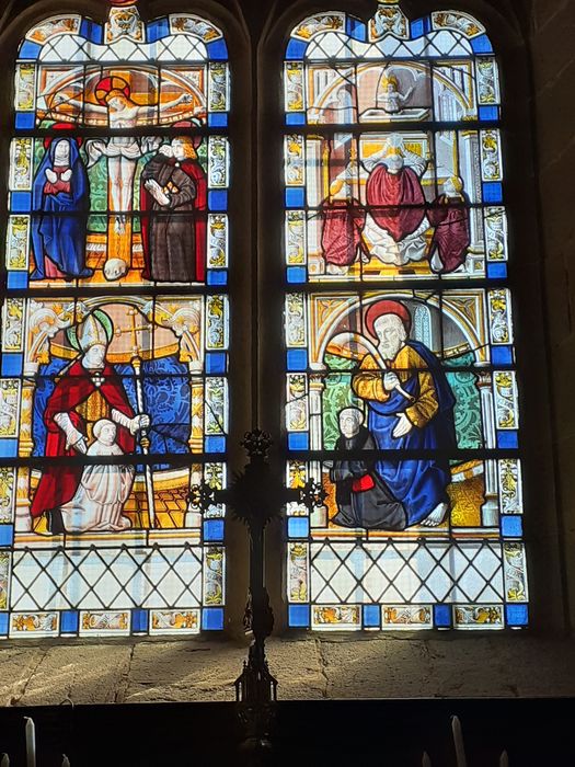 POP | Plateforme ouverte du patrimoineverrière : le Christ en croix entre la Vierge et saint Jean, la Messe de saint Grégoire, les Donateurs avec leurs saints patrons, les Quatre évangélistes