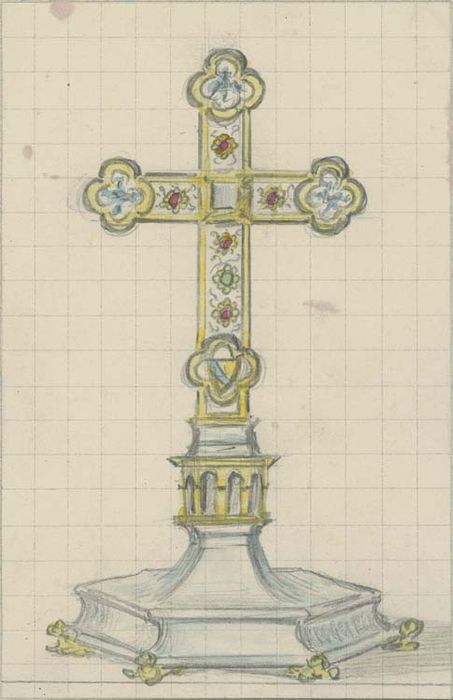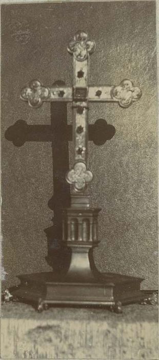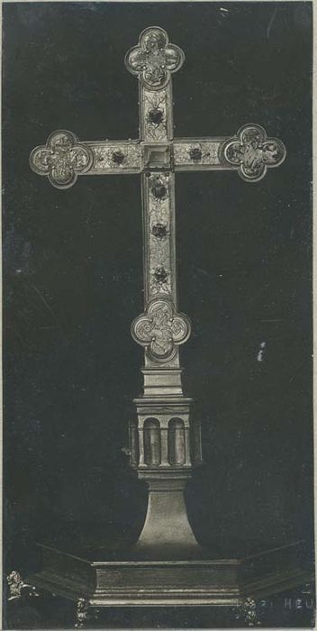 Monté sur un piédestal gothique, le crucifix a les extrémités qui se terminent en fleuron dont la décoration, en émail limousin, porte la figuration des animaux symbolisant les Evangélistes. Les reliques sont enfermées dans une ampoule placée au point d'intersection des branches de la croix. Cinq pierres précieuses, émeraudes et rubis, ornent les branches. Le revers est semblable, sauf les cabochons et les émaux.
