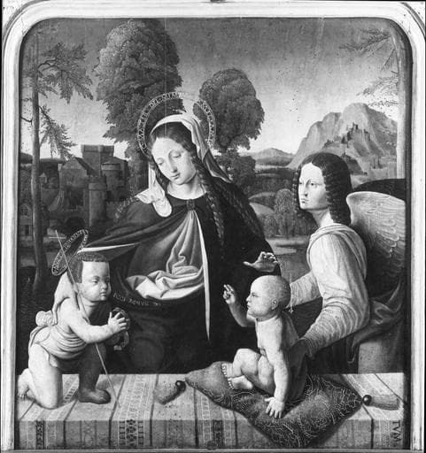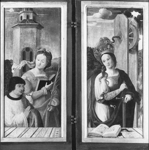 tableau (triptyque) : la Vierge à l'Enfant avec saint Jean-Baptiste, Sainte Barbe, Sainte Catherine, l'Annonciation