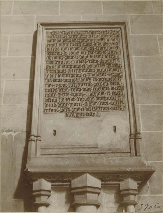 plaque commémorative d'une fondation de messes par le cardinal evêque d'Autun Jehan Rolin, fils de feu Nicolas Rolin, chancelier de Bourgogne