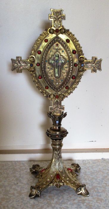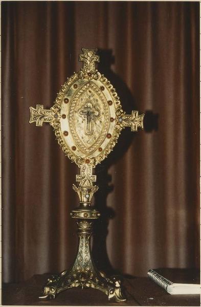 Le reliquaire contient une relique de la Vraie Croix donnée en 1822 par le cardinal della Gebza. Le pied se subdivise en quatre, chaque élément étant terminé par une feuille à trois lobes. Relique au centre d'une mandorle, dans une logette cruciforme.. En haut et de chaque côté de la mandorle, fleuron cruciforme orné de feuilles d'acanthe.