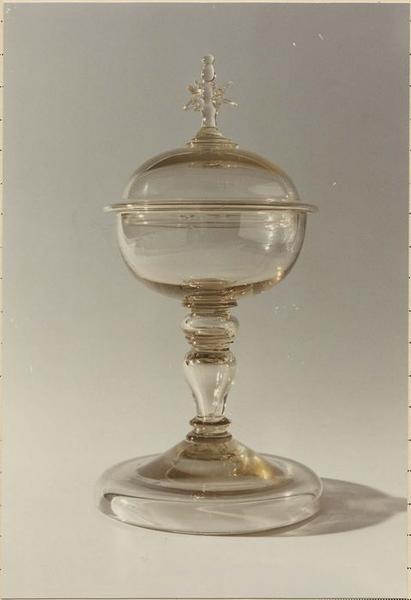 Coupe et couvercle forment une sphère légèrement aplatie en haut et en bas. En haut du couvercle, une croix (modèle de l'Ordre du Saint-Esprit). Tige : bague et poire renversée alternant avec bagues. Pied : profil en doucine.