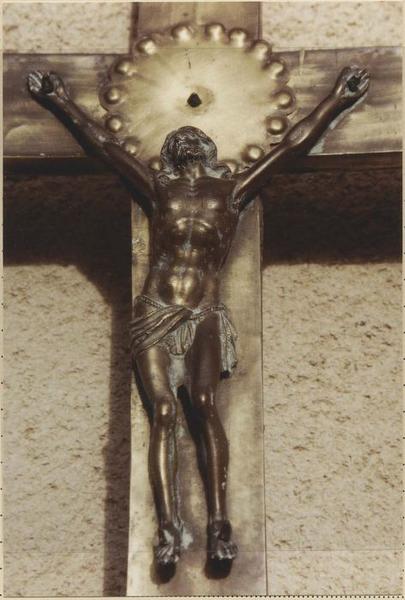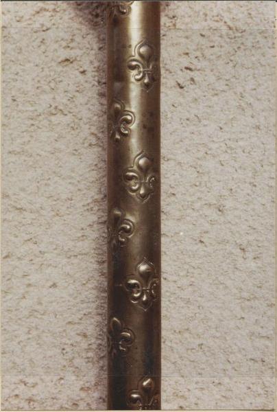 Cette croix de procession présente une hampe fleurdelysée en cinq éléments et un noeud à godrons. Des plaques figurant les évangélistes sont fixées sur les bras et sous l'arbre. Une statuette de la Vierge se trouve au dos. L'objet présente différents éléments ressoudés et de nombreux manques.