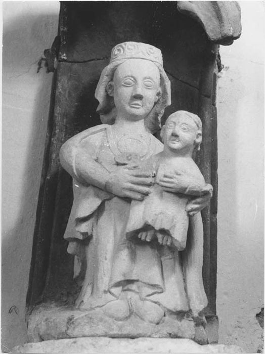 La Vierge à l'Enfant est abritée dans une niche architecturée à arcade trilobée, sculptée dans le même bloc de pierre.