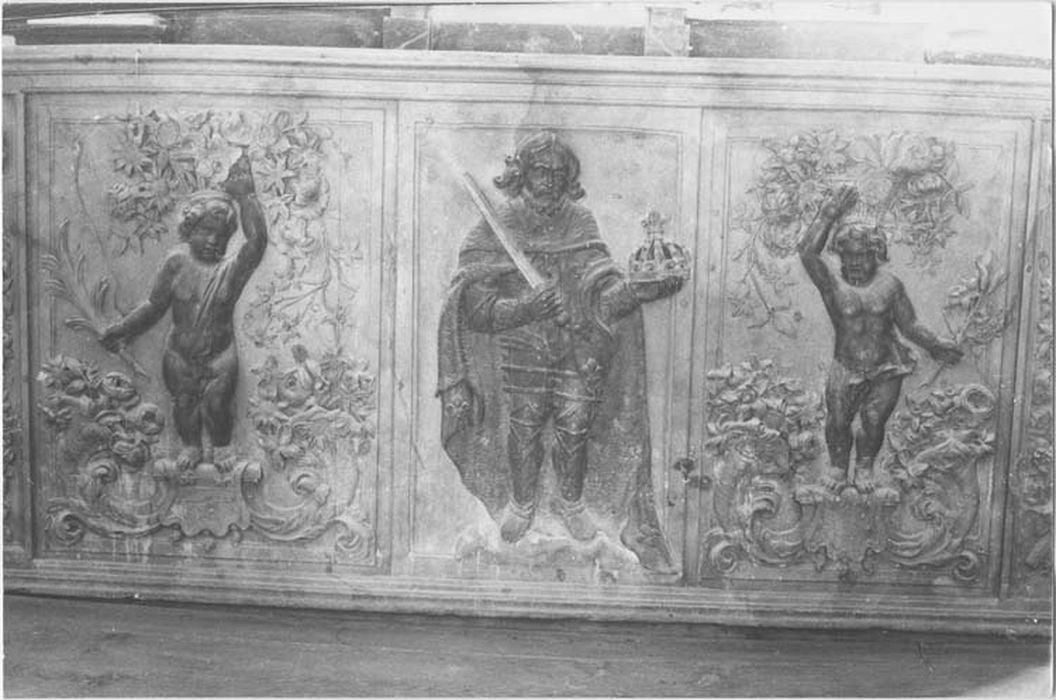 Le retable est décoré de trois compartiments rectangulaires : Charlemagne est représenté dans le compartiment central (vêtu d'une armure, tenant épée et couronne à la main). Il est encadré de deux putti portant un panier de fleurs sur leur tête.