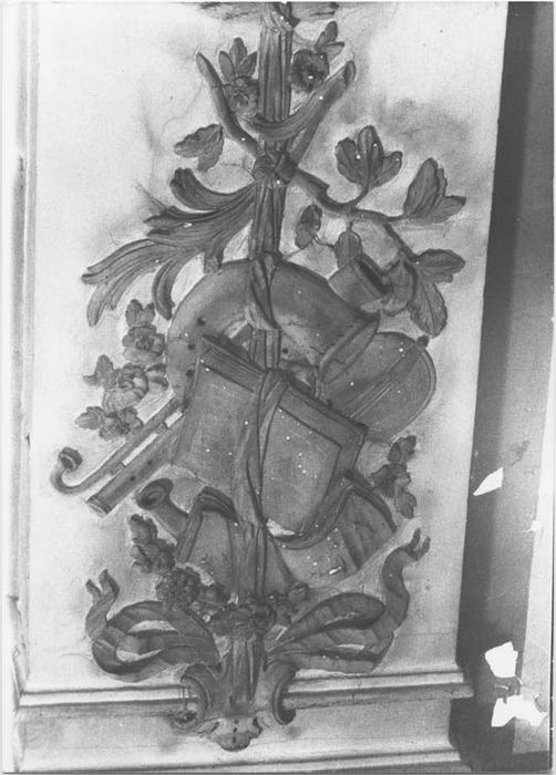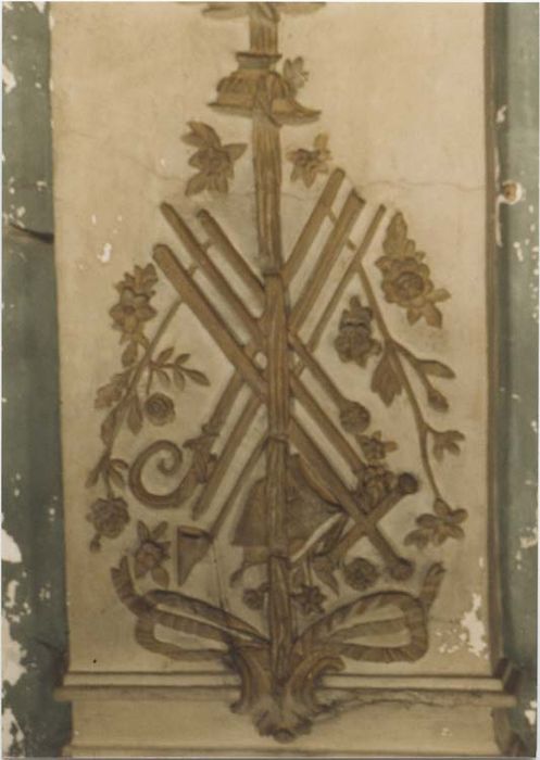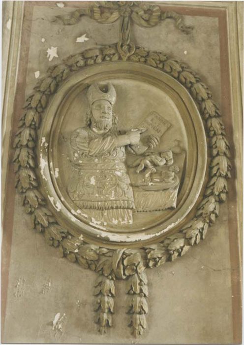 Sur le panneau central figure la Résurrection du Christ, encadrée de deux médaillons en stuc représentant des scènes de l'Ancien Testament. Entre les panneaux, des trophées liturgiques.