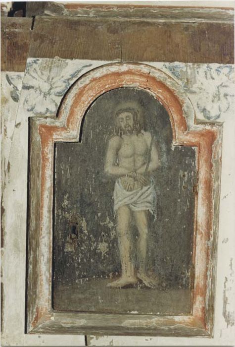 Sur le panneau principal du tabernacle apparaît le Christ souffrant, debout, couronné d'épines, les mains liées par des cordes, le sceptre de roseau à la main. Sur les deux panneaux latéraux qui encadrent le Christ, deux évêques sont représentés, coiffés de la mitre et tenant à la main la crosse.