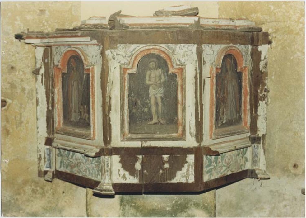 Tabernacle à trois pans coupés sur lesquels sont peintes trois scènes.