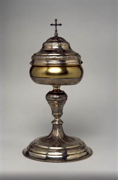 Couvercle sommé d'une croix. Feuilles sur le pied, la fausse-coupe et le couvercle. Fleurettes sur le pied, le noeud de la tige et le couvercle. Frise de perles allongées sur le couvercle.