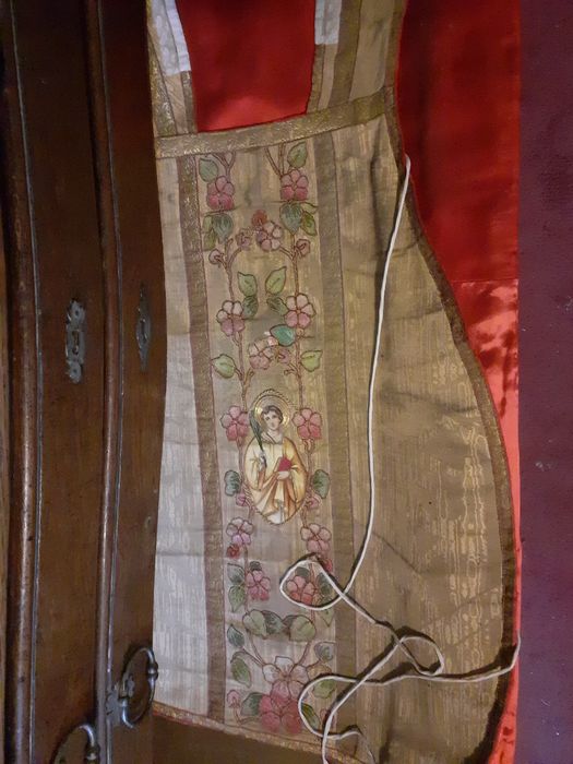 ornement liturgique : chasuble, étole de clerc, manipule ; bourse de corporal, voile de calice