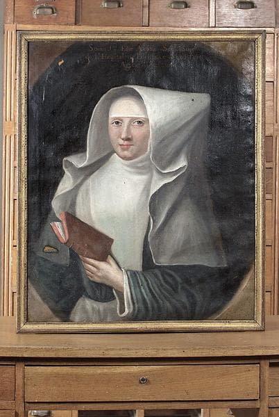 Portrait de soeur Jeanne Elie Aujas à mi-corps et de trois-quarts, tenant un livre.