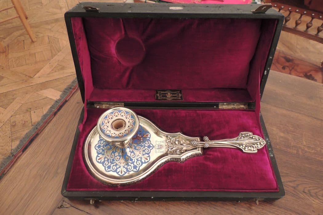 Bougeoir en bronze doré et émaux, écrin en bois, cuir noir et velours de soie rouge.
