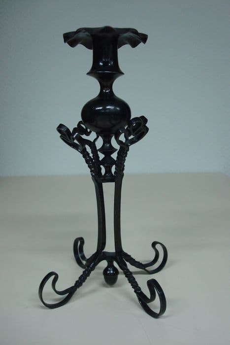 Le corps du chandelier, constitué d'une partie sphérique prolongée par une partie cylindrique, se termine en collerette et repose sur quatre pieds torsadés.